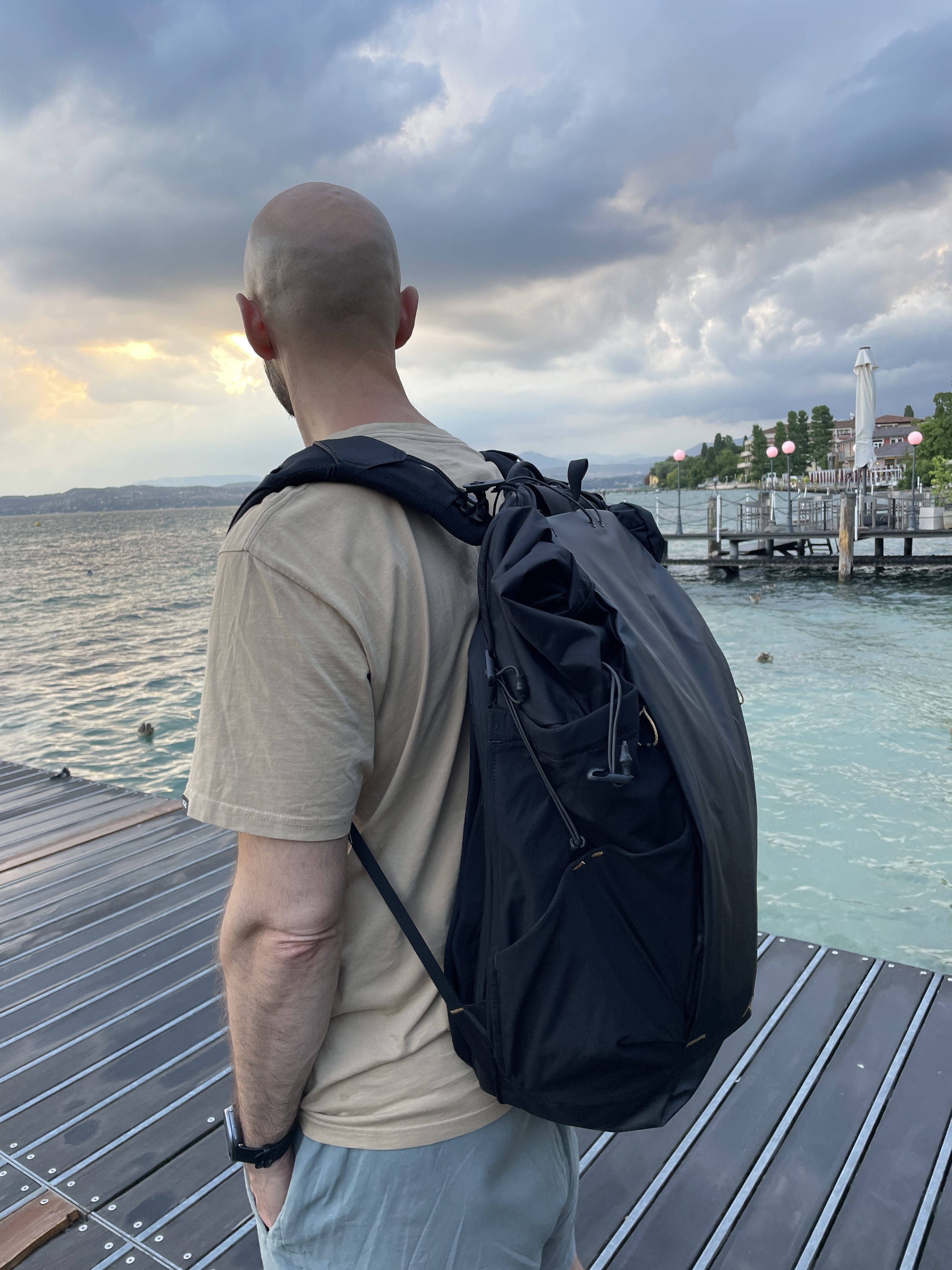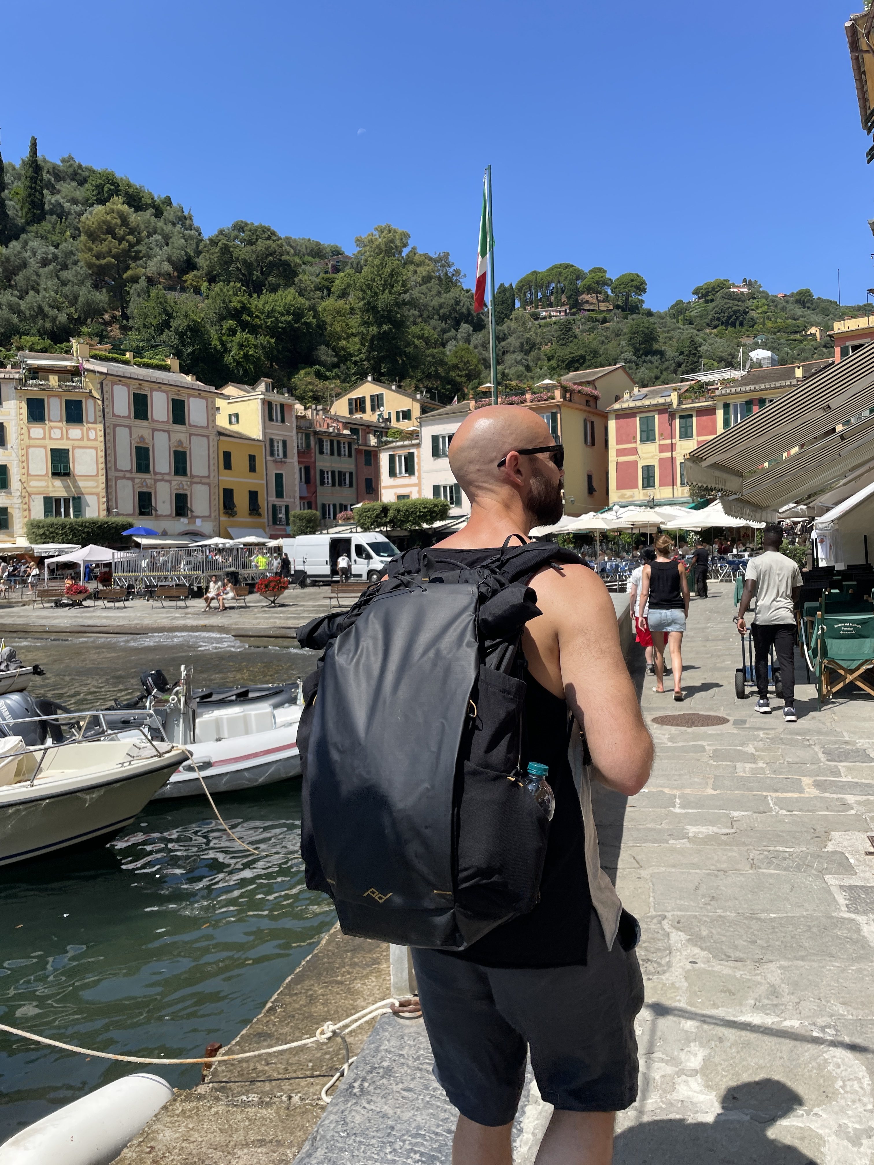Sekken ble med på en langtur til Italia. Den var håndbagasje på flyet, stappa med kamera, laptop, klær og stash gjennom glodheite smågater og strender. Den var med på fjellet, og fungerte som en dagsekk i byen. Kort sagt: én sekk, flere roller.