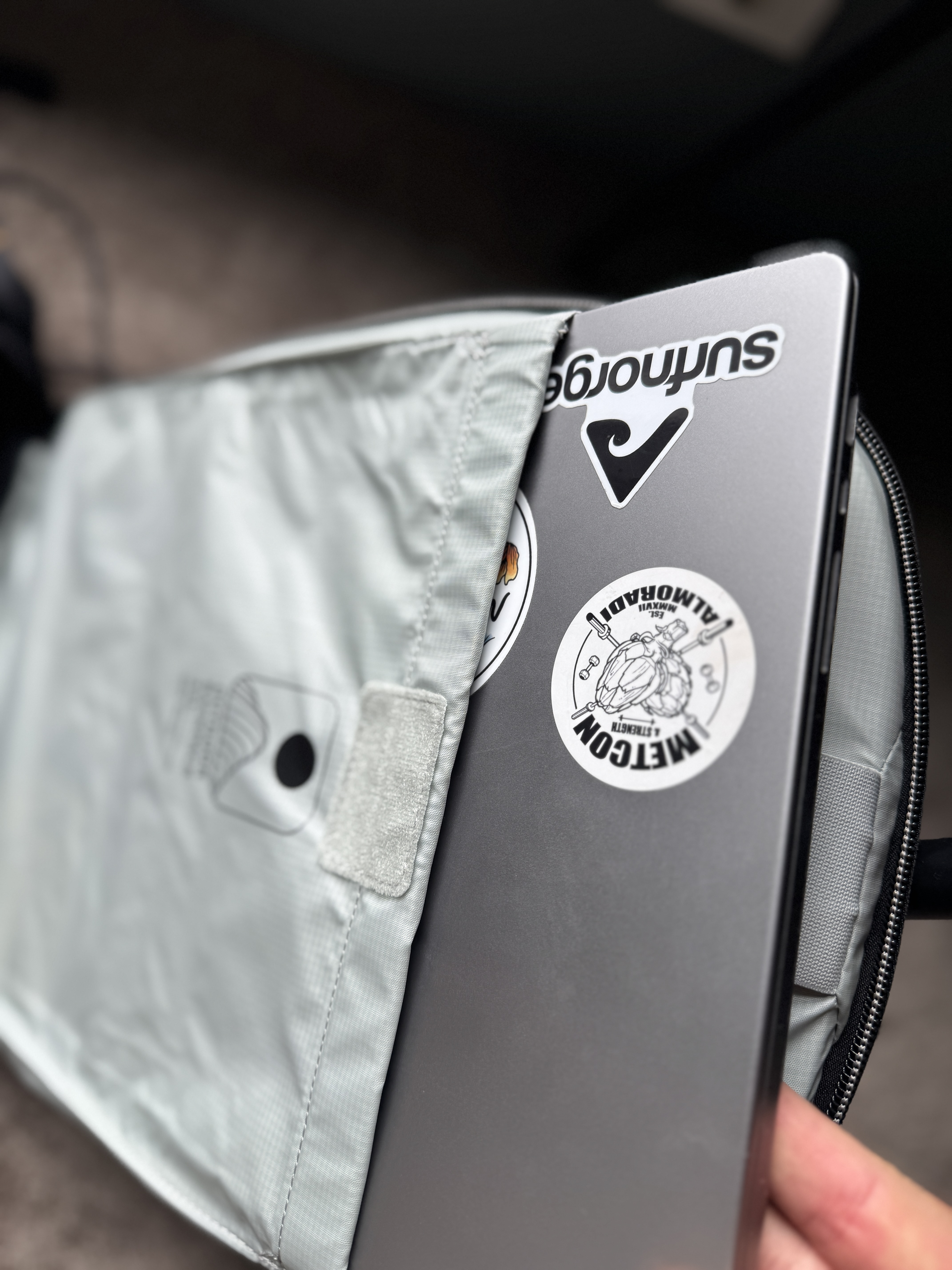 Laptop, kamera, vannflaske, bok og litt klær fikk plass uten problem. Og med Cord Hook™-systemet og de mange utvendige festemulighetene kunne håndkle, underlag og annet rask henges utenpå. Ganske ideelt for en tur som inkluderer både sol og fjellbris.